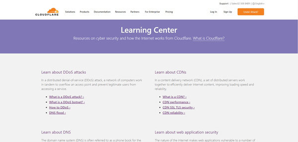 โดยเว็บไซต์จะแบ่งเป็นหัวข้อหลักหลายเรื่องพร้อมเจาะจงลงในรายละเอียดต่อไป เช่น DDos Attack จะพูดถึงความหมายและลักษณะของการโจมตี พร้อมกับขยายความรูปแบบการโจมตีต่างๆ พร้อมแนบมาด้วยโซลูชันจาก Cloudflare ที่นำมาใช้แก้ปัญหา หรือเรื่องของ CDN, DNS, Web Application Security, Web Performance, Serverless, SSL, Access Management และอื่นๆ ที่สามารถเข้าชมได้