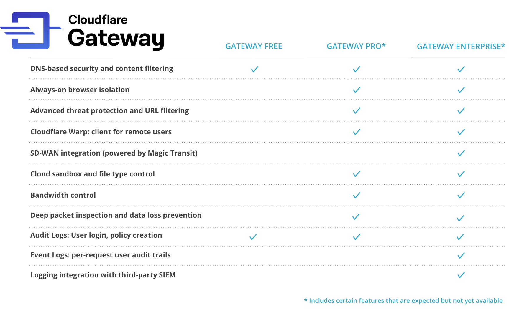 อย่างไรก็ดี Gateway ของ Cloudflare นั้นก็สามารถเริ่มต้นใช้ได้ง่ายเพียงแค่ชี้ DNS เข้ามา ส่วน Gateway Pro จะเสมือนเป็น Full Proxy ที่สามารถตั้งค่าได้จาก WARP หรือสามารถใช้ (Mobile Device Management) MDM บังคับการตั้งค่าหรือทำ GRE Tunnel มาจากเราเตอร์ ในส่วนสุดท้าย Gateway Enterprise คือการนำ Remote Browser Isotion จาก S2 Systems ที่ Cloudflare เพิ่งซื้อเข้ามาให้องค์กรควบคุมการใช้งานของ Browser ได้อย่างมั่นใจ