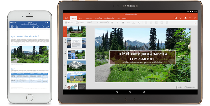 • ค้นพบคุณฟีเจอร์การแก้ไข การจัดรูปแบบ และการเขียนร่วมขั้นสูงในโทรศัพท์และแท็บเล็ต โดยลงชื่อเข้าใช้ด้วยบัญชี Microsoft ที่คุณใช้ขณะซื้อ Office 365