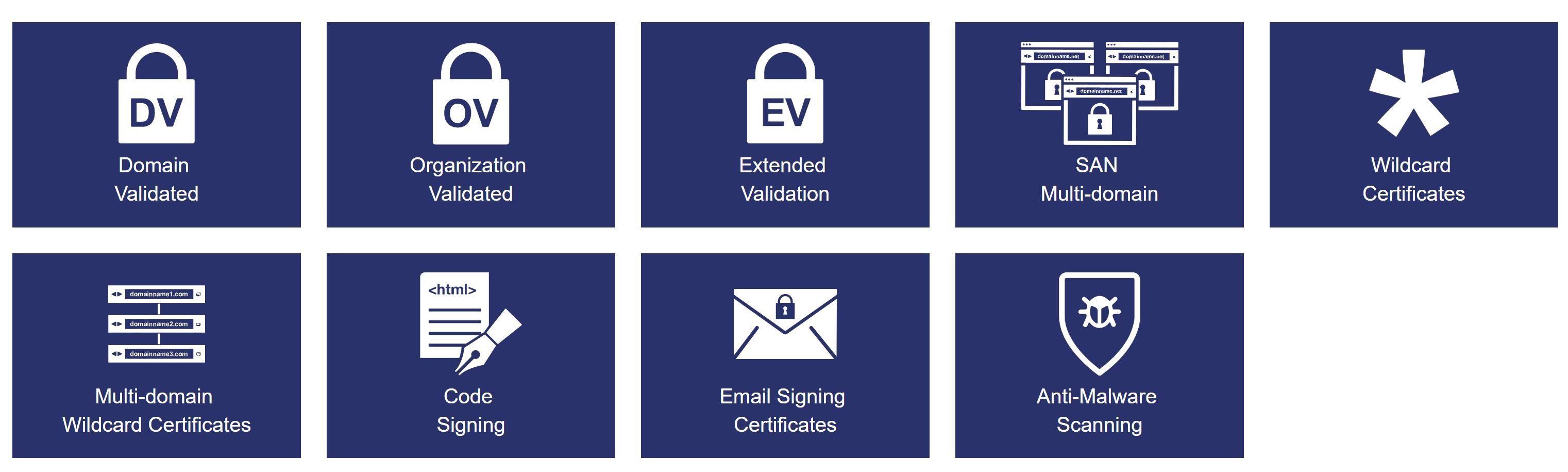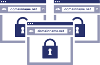 Wildcard SSL certificates cover one domain name and an unlimited amount of sub-domains. For example, a Wildcard SSL certificate can cover www.domain.com, email.domain.com, login.domain.com, xyz.domain.com, etc. These certificates are extremely popular, affordable, and convenient solutions – since most domains have subdomains. Also, they are available in both DV and OV types, with no EV Wildcard SSL certificate currently available. Wildcard SSL certificates offer up to 256-bit encryption on all of the domains and subdomains that they cover.