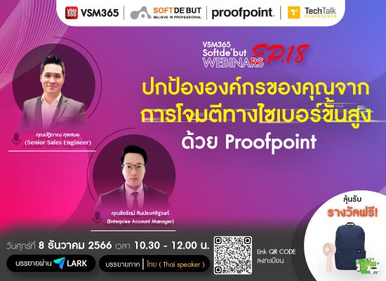 TechTalkThai เชิญผู้สนใจเข้าร่วมงาน VSM365 | Softde’but Webinar Ep.18 ในหัวข้อ   ❝ ปกป้ององค์กรของคุณ จากการโจมตีทางไซเบอร์ขั้นสูง ด้วย Proofpoint ❞