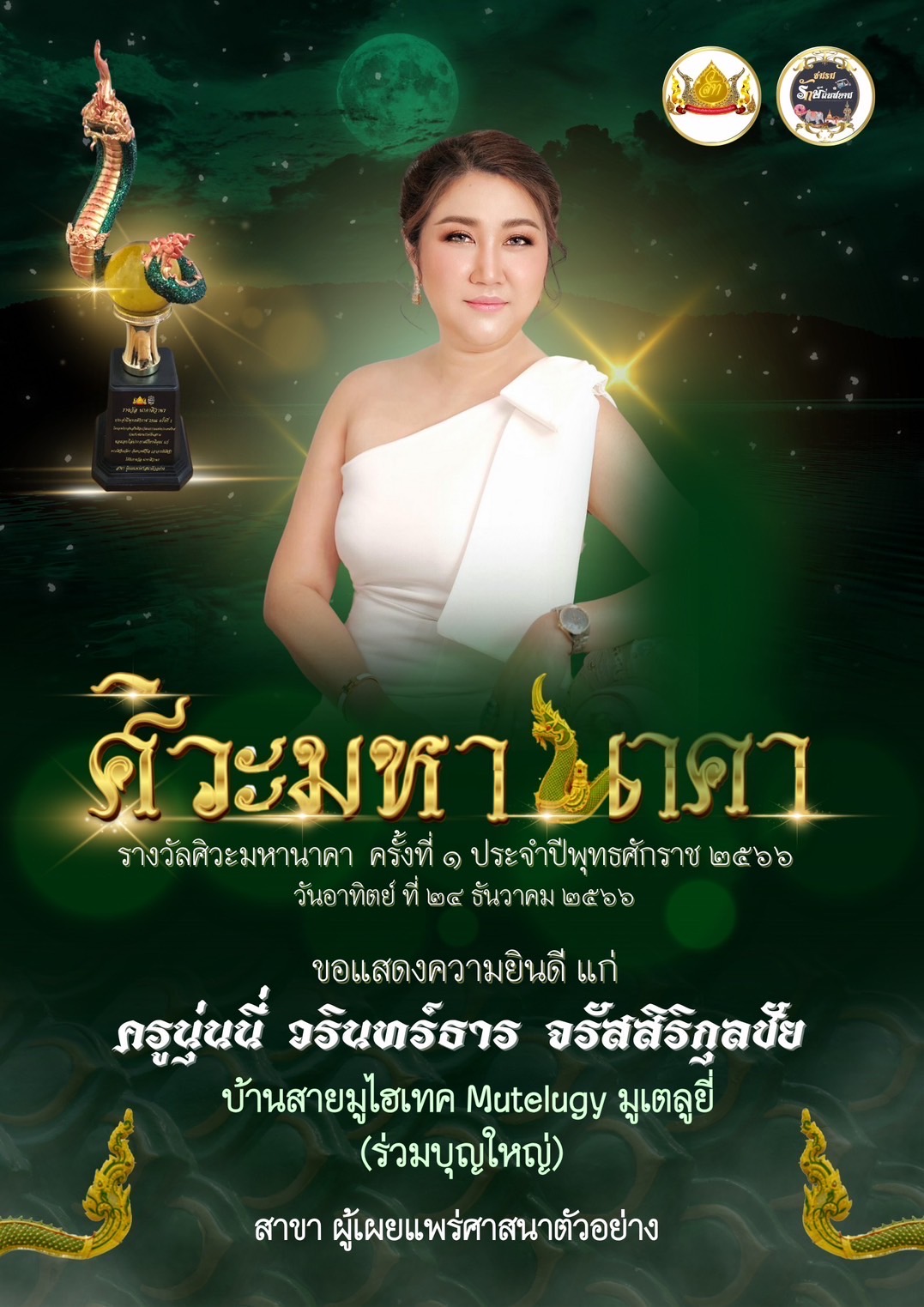 งานรางวัลศิวะมหานาคา ครูนุ่นนี่ วรินทร์ธาร จรัสสิริกุลชัย ผู้บริหาร Digital Platform VSM365 และ มูเตลูยี่ บ้านสายมูไฮเทค ได้รับเกียรติเข้ารับรางวัลในสาขา ผู้เผยแพร่ศาสนาตัวอย่าง  รางวัลพญานาคตระกูลสีเขียว (ตระกูลเอราปถ) ในลูกหลานสายญาณบารมีนาคราช พ่อปู่ศรีสุทโธ แม่ย่าศรีปทุมมา พร้อมทั้งได้รับเชิญเป็นนางแบบกิตติมศักดิ์ ร่วมเดินแบบชุดผ้าไทย ในลุค “เจ้าแม่นาคี”