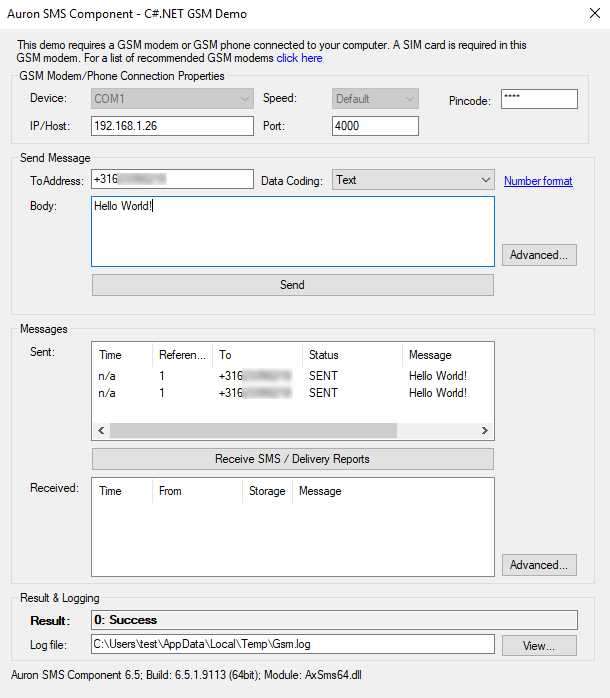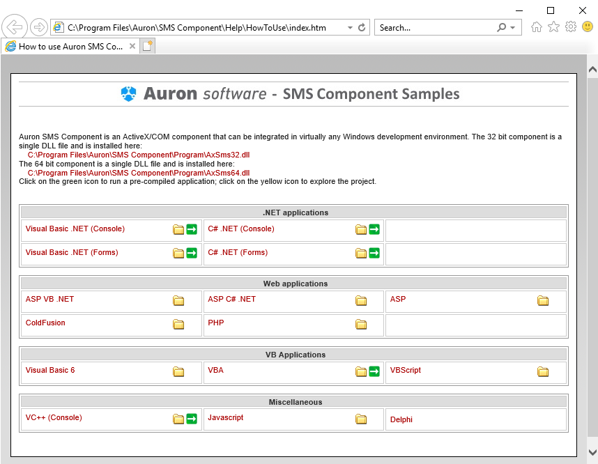 Use the Auron SMS Component on the Windows platform with any programming language that has basic COM support.
