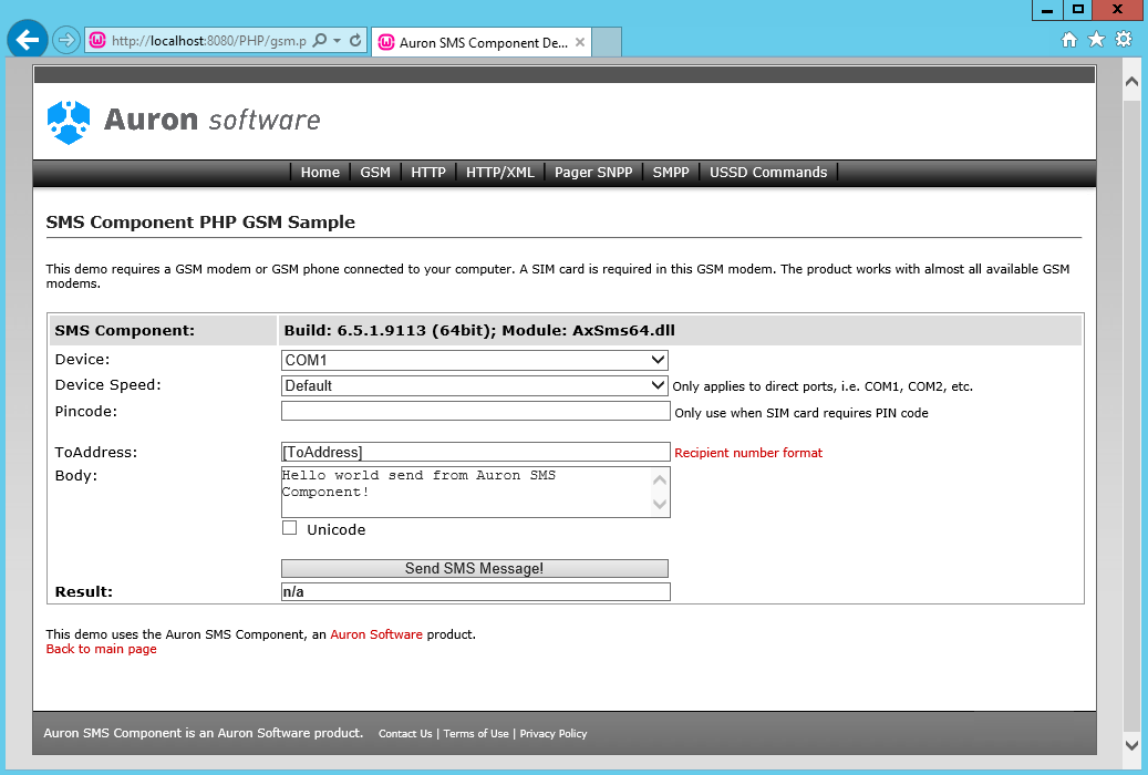 Use the Auron SMS Component on the Windows platform with any programming language that has basic COM support.