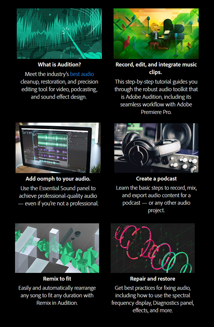 Audition is a comprehensive toolset that includes multitrack, waveform, and spectral display for creating, mixing, editing, and restoring audio content. This powerful audio workstation is designed to accelerate video production workflows and audio finishing — and deliver a polished mix with pristine sound.