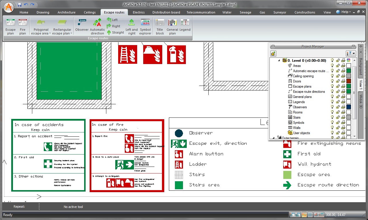 Such plans must be available in public utility buildings (hotels, shopping malls, etc.) to assist people inside such a facility to find the fastest evacuation route from the building in case of fire or any other emergency situations. A user can create evacuation maps on the basis of existing building and spatial development plans (formats: DWG, IFC, DXF) or make their own drawings representing a given area using the ArCADia system tools. The program offers a symbol and board library for protection and evacuation in the case of fire. The library content can be edited.