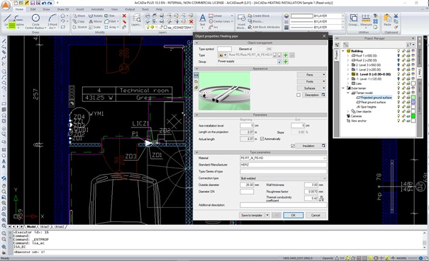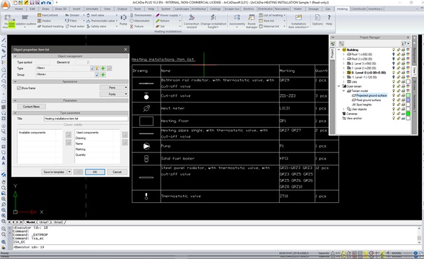 The program allows the structural insertion of drawing elements on architectural foundations with the simultaneous creation of calculations schemes and the generation of three types of axonometric views. Additionally, it allows automatic selection of elements with consideration of the user’s preferences (a choice of catalogues for selecting elements) and automatic generation or reports and bills of materials or objects used in the project. The design may be executed on views of buildings created in the ArCADia-ARCHITECTURE program and executed in a CAD environment in the form of raster or vector files. The user may employ the library of elements used in heating installations, which can be expanded and adapted to the user’s needs in terms of the used equipment and types of pipeline materials. Furthermore, it is possible to develop a personal template with the option to save personal default settings for each program element and transfer it along with the project.