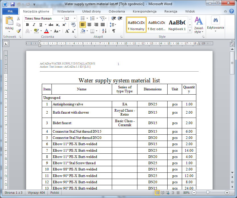 The program allows the object-oriented insertion of drawing elements on architectural background drawings, including the creation of design diagrams and the generation of three types of axonometric projections. In addition, the program enables the automatic selection of elements, taking account of user preferences (elements are selected from catalogues) and the automatic generation of reports and bills of materials or objects used in the design. Water supply systems can be designed on the plans of buildings produced in the ArCADia-ARCHITECTURE program and designed in a CAD environment in the form of bitmap or vector files. The user can use the library of elements used in water supply systems, which can be extended and adapted to their own needs in the scope of machinery used and pipeline material types. A user template can also be prepared, including the possibility to save personalised default settings for each program element and transfer them together with a design.