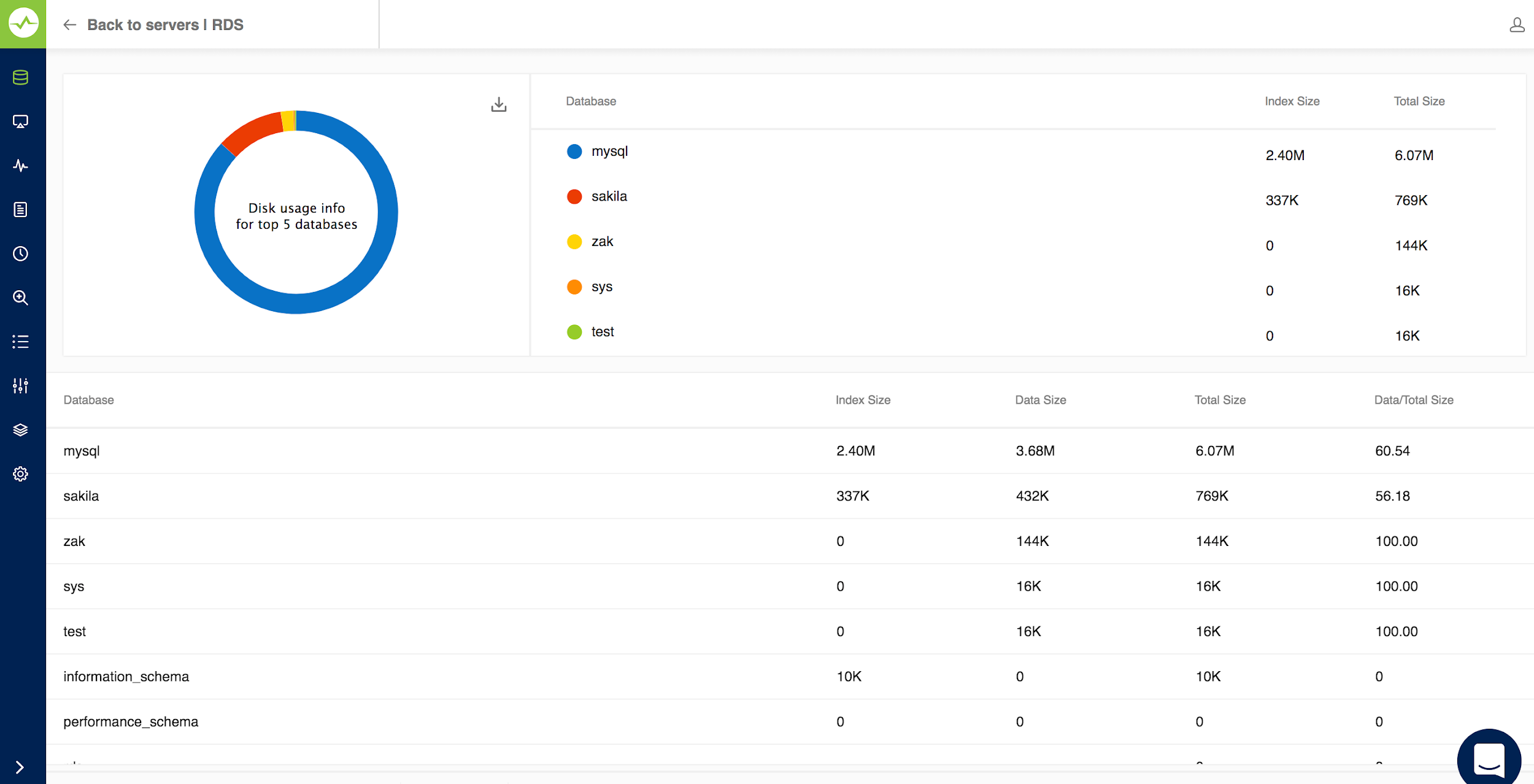 Analyze disk space usage by displaying the number of databases with their data and index sizes to see which MySQL and MariaDB servers take up the most space. View snapshots and charts of disk space occupied by databases on servers and tables in databases to quickly spot the largest databases and tables.