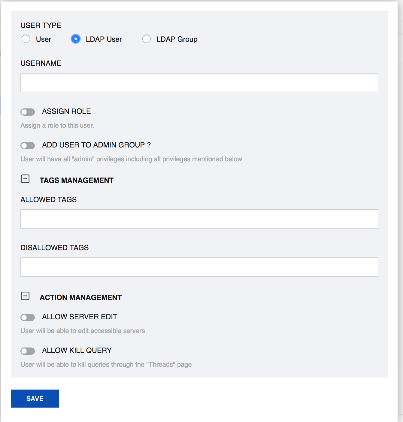 Set up users who have limited access to specified servers and settings. Specify the type of user, role, and allowed and disallowed actions, tags, and tabs. Manage user access to prevent accidental actions, executing non-reversible operations, and changing server settings without administrator knowledge.