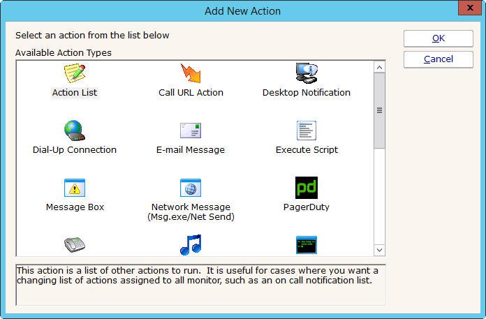 Similar to the Execute Script monitor, this Action lets you extend the list of available actions via your own script written in VBScript. Many variables from the source monitor are also available for creating rich, situation-specific responses.