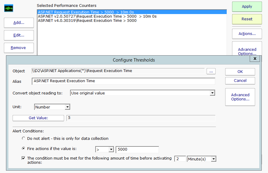 The entire breadth of the system Performance Counters can be monitored allowing you to set actionable thresholds on CPU usage, memory usage, NIC traffic, etc. Performance counter values are stored in a database so you can view historical counter reports and understand trends.