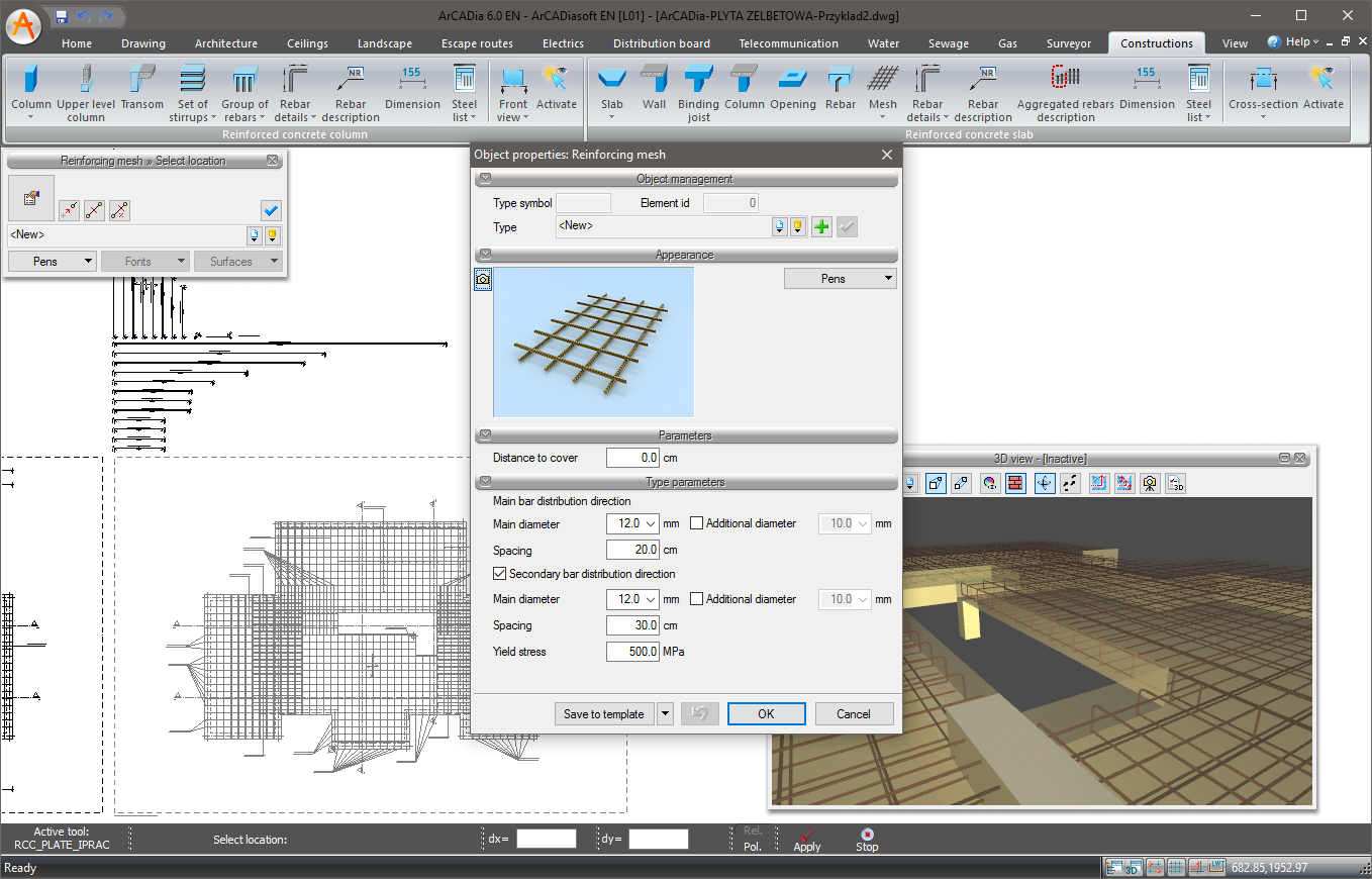 The ArCADia-REINFORCED CONCRETE SLAB is a structural program, which creates a spatial model of the slab’s reinforcement, allows further editing and, for example, automatic creation of new slab cross-sections, based on the data entered by the user, in the form of views of the slab’s top and bottom reinforcement plates and the element’s cross-sections. The shaping of the slab’s reinforcement plate in the program is possible based on the guidelines specified in the PN-EN 1992-1-1 Eurocode 2: September 2008 standard. This program allows the entry of data regarding the slab’s shape and support by the design engineer and captures data concerning the slab’s shape and support directly from the ArCADia-ARCHITECTURE program based on the set ceiling. If the cover of the given level in the ArCADia-ARCHITECTURE consists of several ceilings, all ceilings after their selection are transferred to the ArCADia-REINFORCED CONCRETE SLAB program as separate models of reinforced concrete slabs.