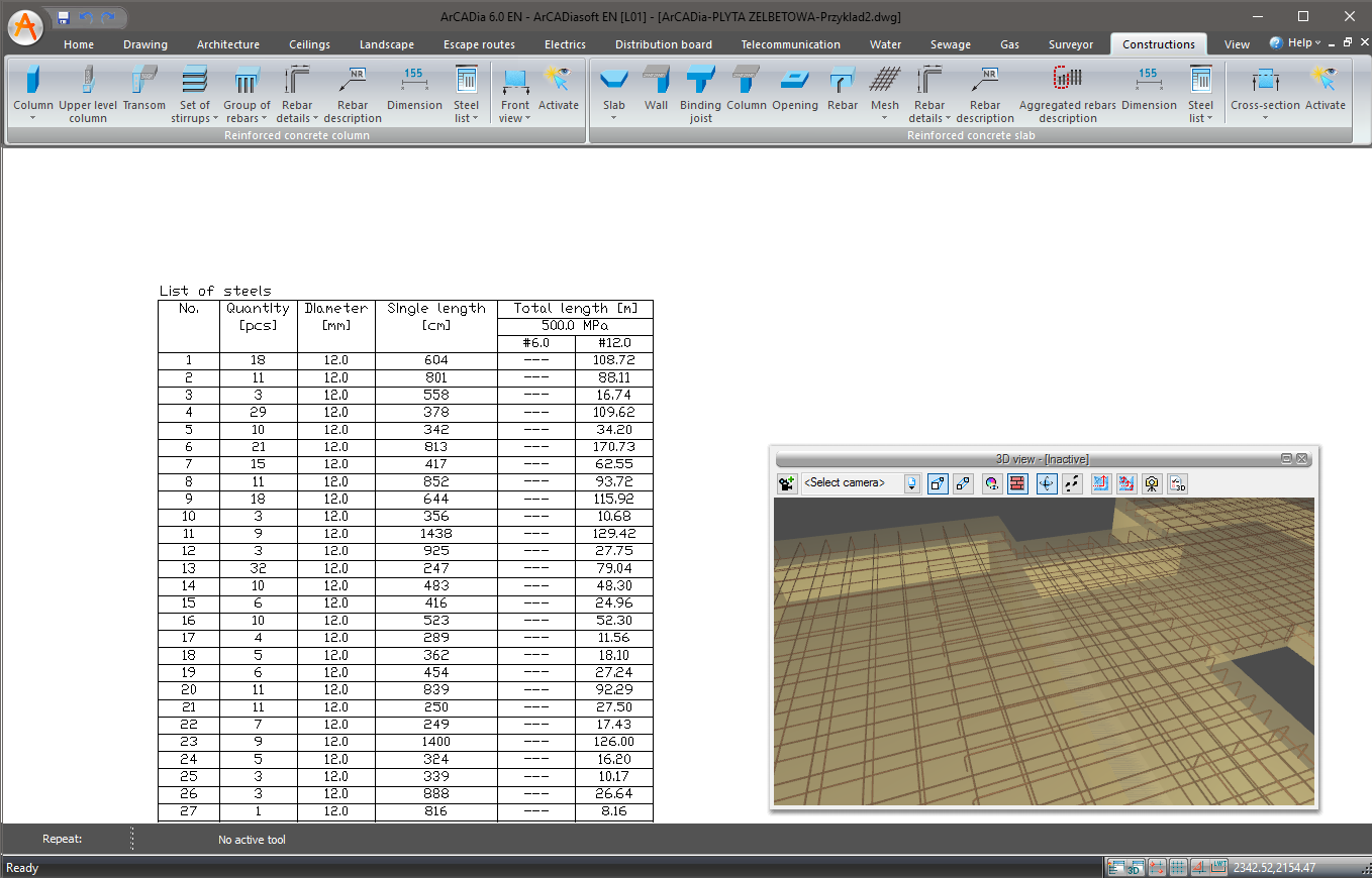 • Automatic creation and modification of the list of reinforcement steel based on the created reinforcement model (list for a single slab or list for the entire drawing).