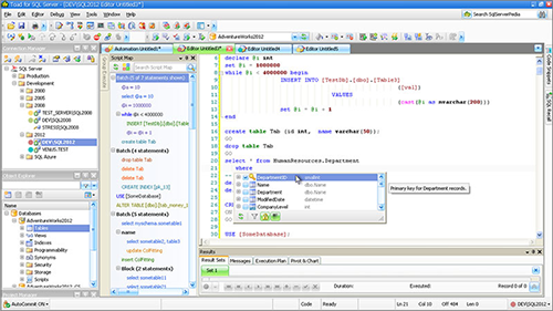 With Toad® for SQL Server, you get extensive automation, intuitive workflows and built-in expertise to maximize productivity and reduce risk. This comprehensive toolset complements Microsoft tools by solving key SQL Server challenges, so you can proactively manage many databases. You’ll easily resolve issues, manage change and promote the highest levels of code quality, performance and scalability with Toad® for SQL Server.