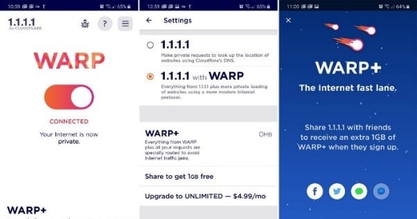 •    WARP –  เวอร์ชั่นฟรี แต่จะไม่มีการจำกัด Bandwidth หรือการใช้แต่อย่างใดพร้อมได้ความเร็วเหมือนการใช้งานปกติ