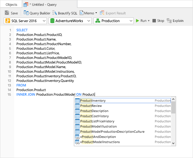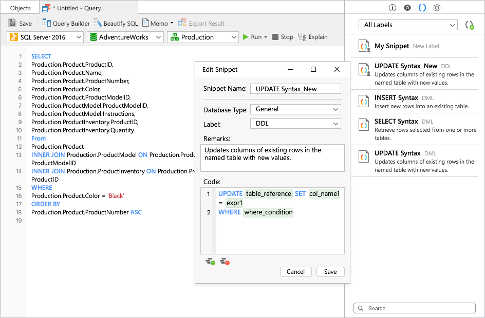 ✔ ตัวอย่างโค้ดและ การเติมโค้ดให้สมบูรณ์ : SQL Navicat 12 มีชุดของตัวอย่างที่กำหนดไว้ล่วงหน้าหรือคุณสามารถสร้างตัวอย่างของคุณเองที่คุณใช้กันทั่วไป และลดจำนวนเวลาที่ใช้ในการเขียนรหัสซ้ำและลดโอกาสในการเกิดข้อผิดพลาดได้และ การเติมโค้ดให้สมบูรณ์เพื่อสนับสนุนคำหลักและคำแนะนำเพิ่มเติมและทำการปรับปรุงประสิทธิภาพและความถูกต้องของการเติมข้อความอัตโนมัติอีกด้วย