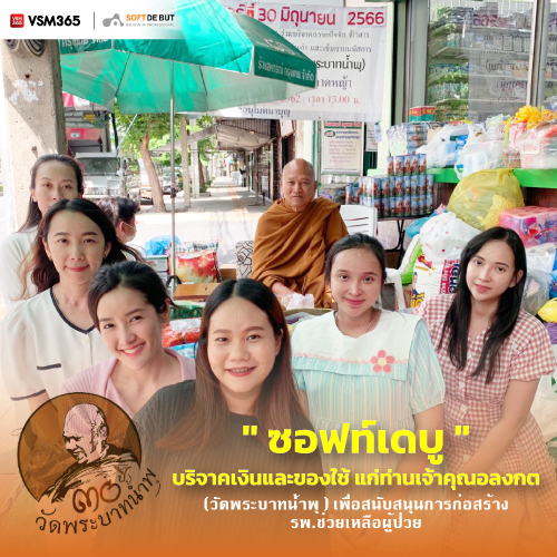 บริษัท ซอฟท์เดบู จำกัด นำโดย คุณนุ่นนี่ จรัสสิริกุลชัย ผู้บริหาร บริษัท ซอฟท์เดบู จำกัด และ ตัวแทนพนักงานบริษัทฯ ร่วมถวายบริจาค ข้าวสาร อาหารแห้ง แพมเพิส ทิชชู เสื้อผ้าใหม่ และปัจจัย ถวายกับท่านเจ้าคุณอลงกต (เจ้าอาวาสวัดน้ำบาทน้ำพุ ) วัดพระบาทน้ำพุ จังหวัดลพบุรี เพื่อช่วยเหลือสนับสนุนกิจกรรมที่ทางวัด ได้ดำเนินก่อสร้าง โรงพยาบาล ขนาด 400 เตียง เพื่อ ดูแลผู้ป่วยและเด็กกำพร้าในอุปการะ คนชรา พระสงฆ์อาพาธ รวมถึงผู้ป่วยมะเร็งระยะสุดท้ายกว่า200 ชีวิต ซึ่งถือเป็นกิจกรรมประจำปีที่ ทางสหกรณ์กรุงเทพฯ สาขา ลาดหญ้า ได้จัดขึ้นทุกปี เมื่อวันที่ 30 มิถุนายน 2566 ที่ผ่านมา