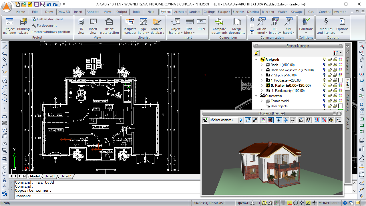 ArCADia is a program supporting 2D and 3D design. Due to its operational philosophy and the same data saving format (DWG), it closely resembles the Autocad program.