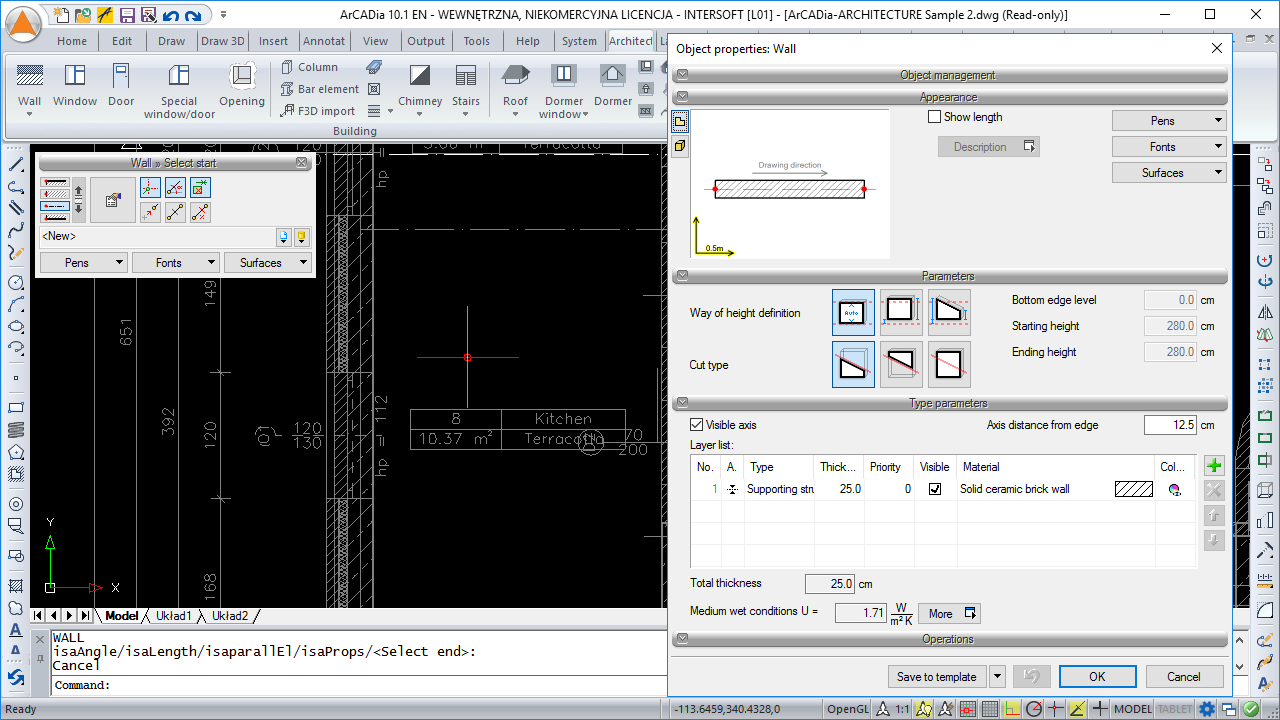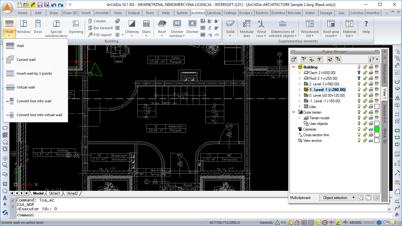 • The possibility to transform a 2D drawing created from polylines or lines into the plan of single- or multi-layer walls, virtual walls or a foundation plan.