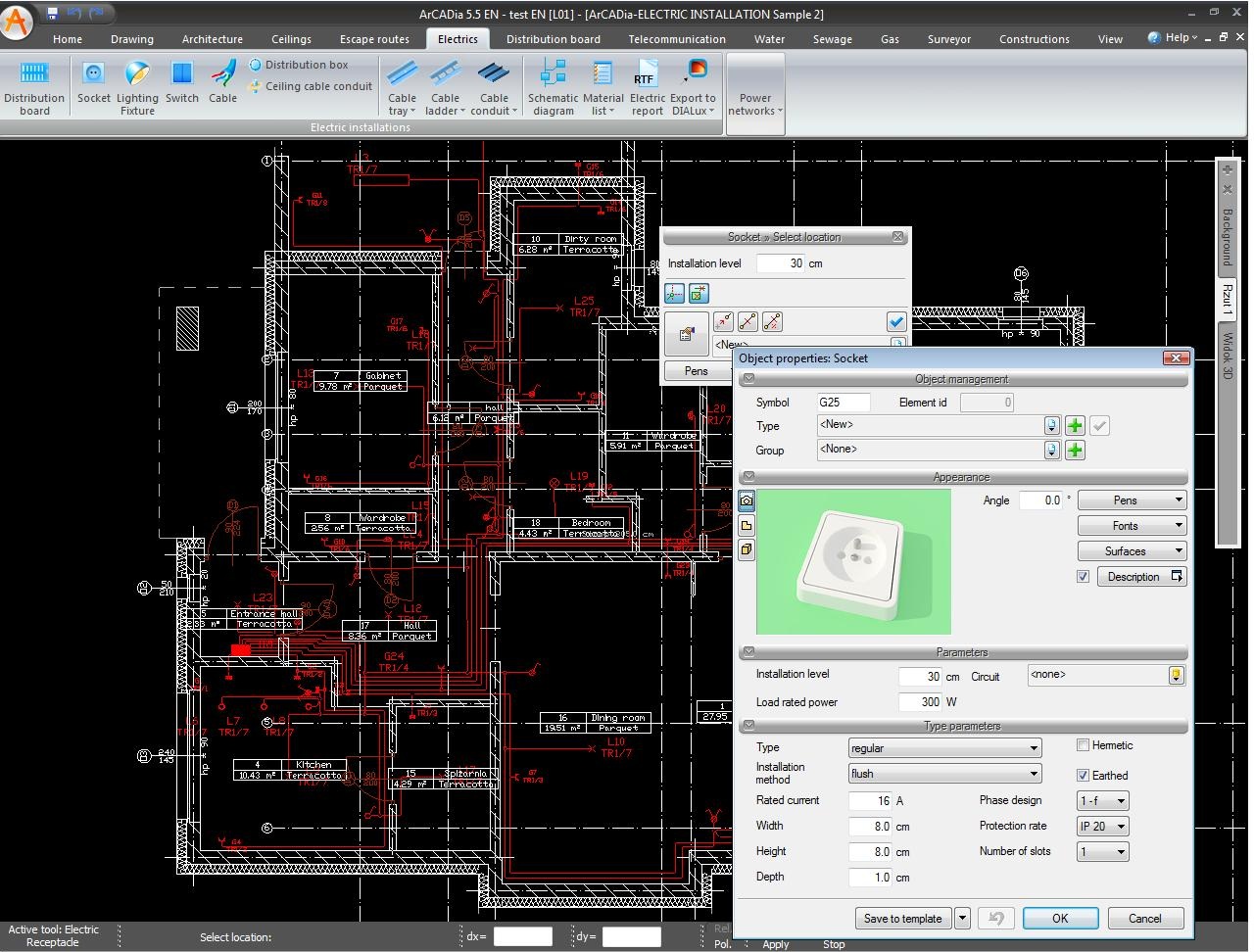 • Drawings of internal electrical systems can be quickly produced on architectural plans, starting from locating distribution panels, assigning the proper technical parameters, arranging sockets, lighting and cable outlets to connect power supply sources with appliances using cables and conductors.