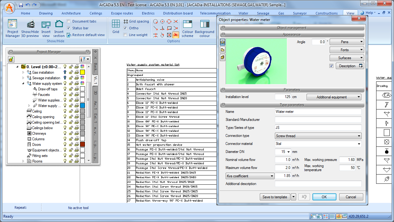 - Fittings and devices are inserted from the comprehensive library of manufacturers (water outlets, stop and check valves, safety, fire and control fittings, metering devices, filters, mixers).