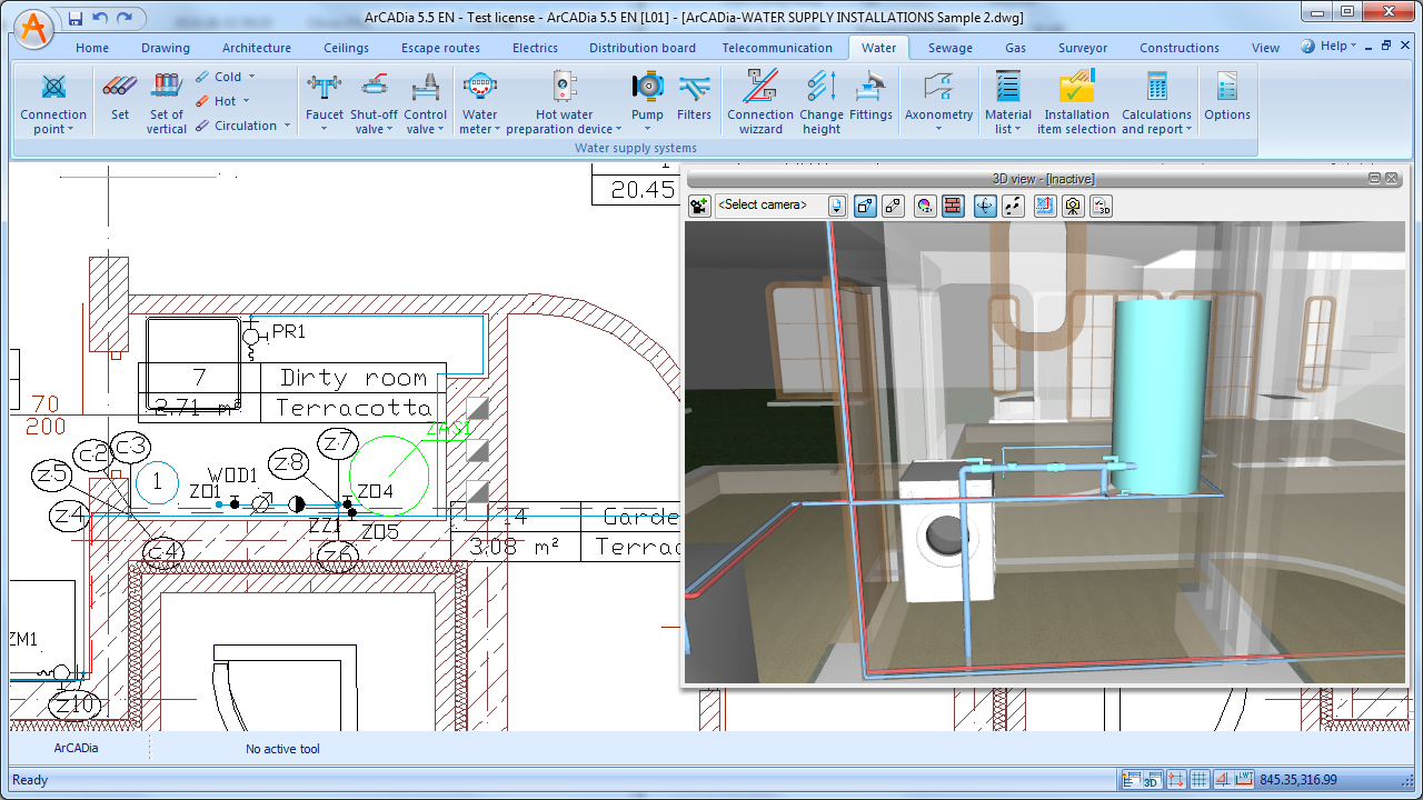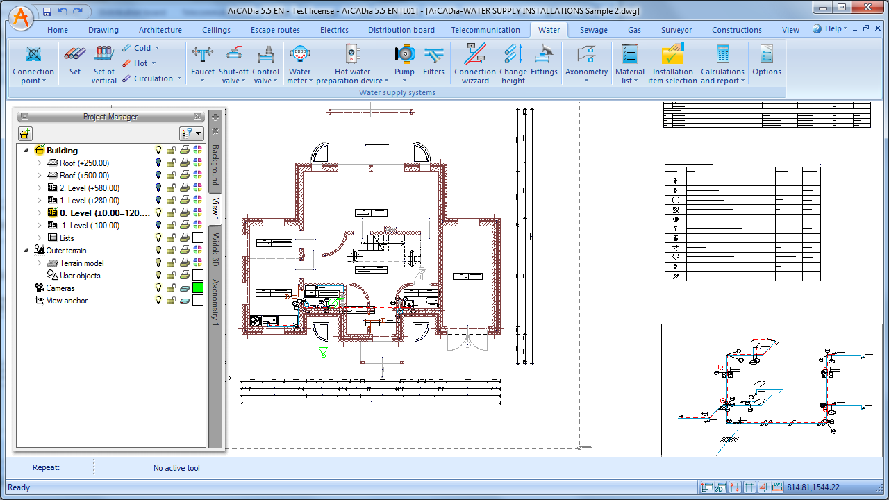 The program allows the object-oriented insertion of drawing elements on architectural background drawings, including the creation of design diagrams and the generation of three types of axonometric projections. In addition, the program enables the automatic selection of elements, taking account of user preferences (elements are selected from catalogues) and the automatic generation of reports and bills of materials or objects used in the design. Water supply systems can be designed on the plans of buildings produced in the ArCADia-ARCHITECTURE program and designed in a CAD environment in the form of bitmap or vector files. The user can use the library of elements used in water supply systems, which can be extended and adapted to their own needs in the scope of machinery used and pipeline material types. A user template can also be prepared, including the possibility to save personalised default settings for each program element and transfer them together with a design.