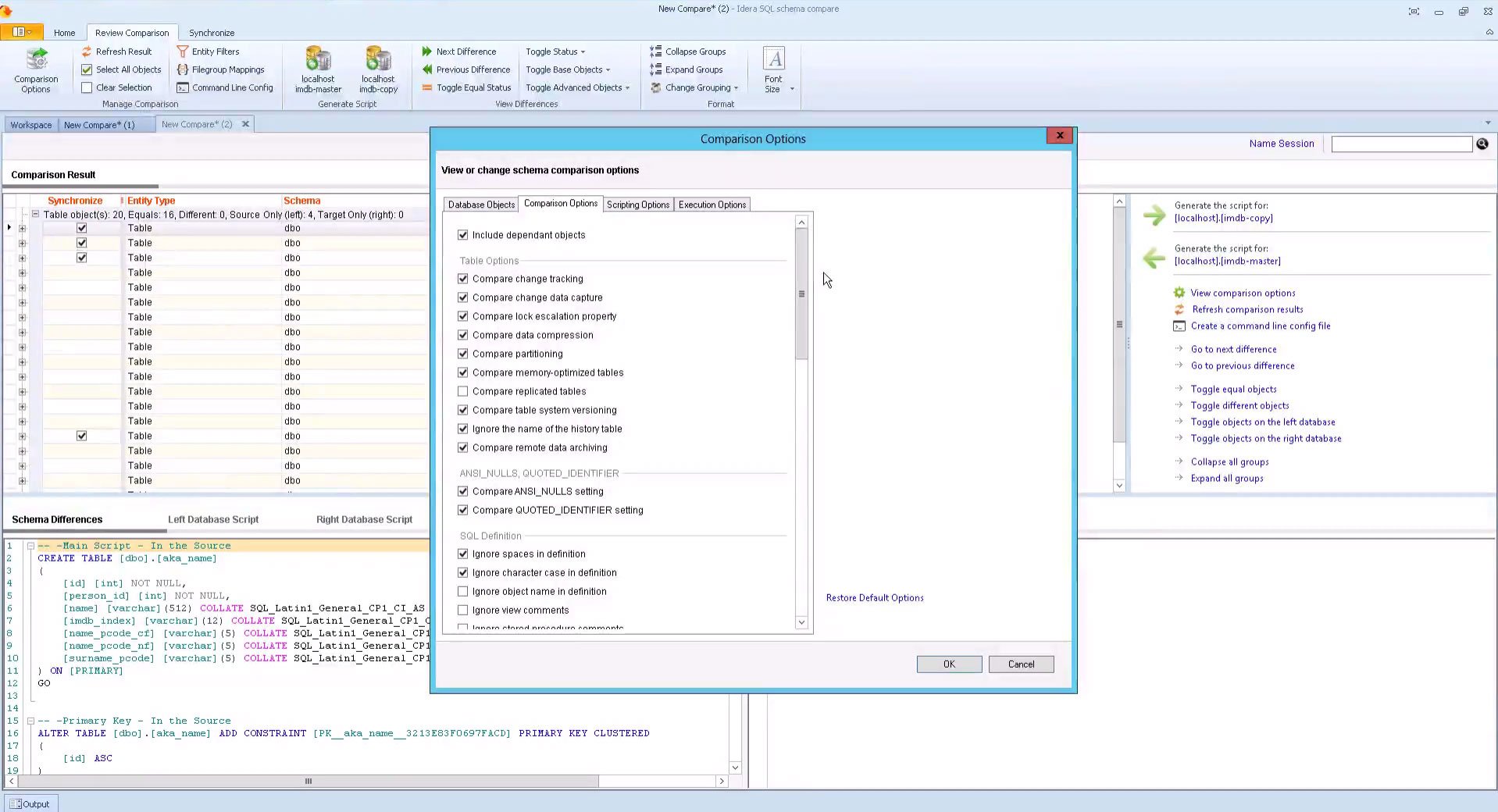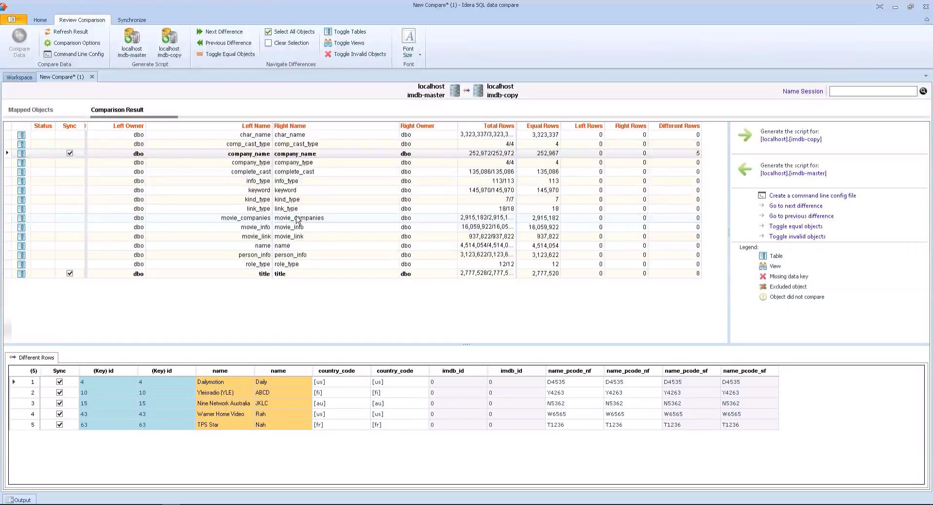 IDERA SQL Comparison Toolset provides an easy, automated way to compare schema and data, generate synchronization scripts, and deploy those scripts to synchronize databases. Whether migrating changes from test to production or repairing unwanted changes, IDERA SQL Comparison Toolset saves you time and reduce the headaches of performing manual database comparisons mistakenly applied and unwanted changes.