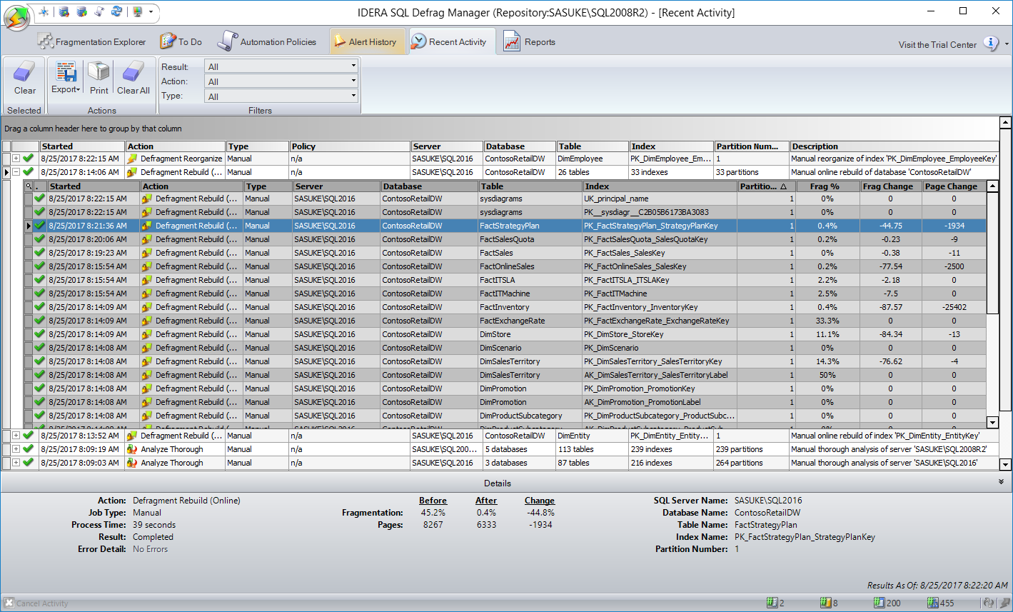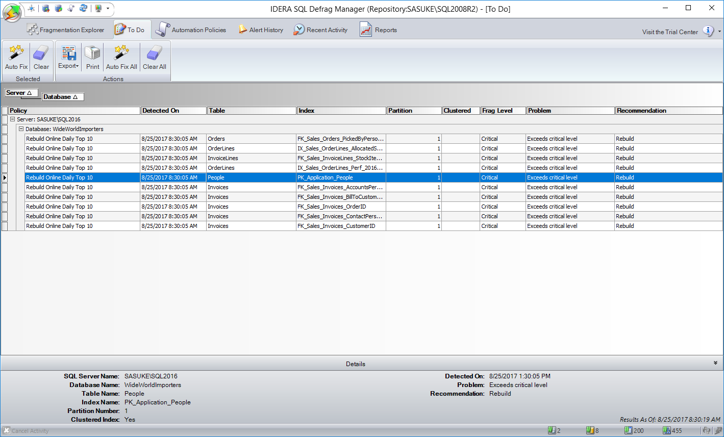 Access built-in reports that target technical and managerial audiences. Report on worst fragmented instances, databases, tables and indexes, and more.