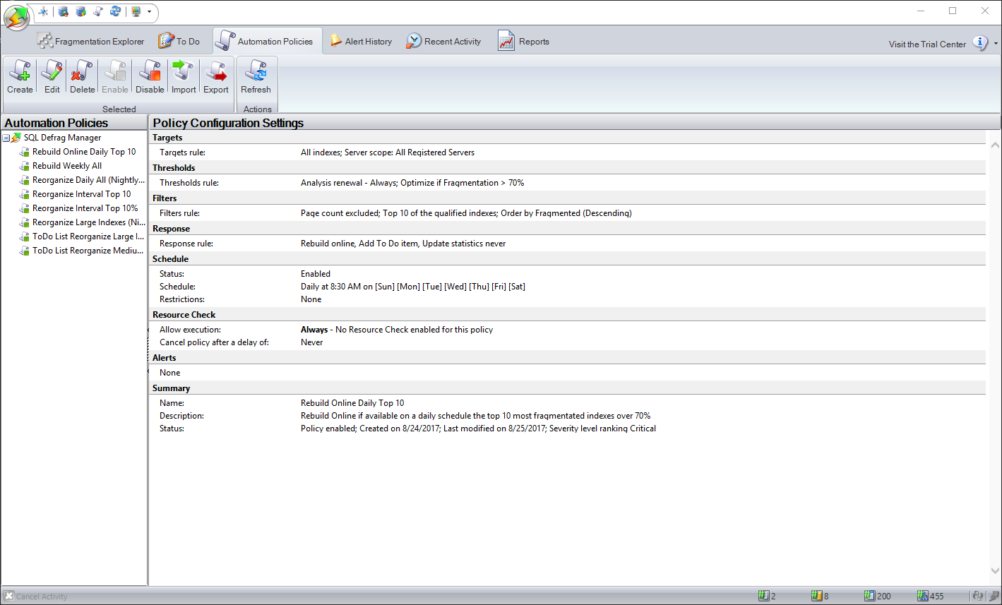 Apply policies for defragmentation of database indexes at level of instances, database, and indexes. Apply the same policy to multiple objects at simultaneously.