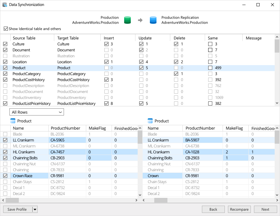 การถ่ายโอนข้อมูล การซิงโครไนซ์ข้อมูล และการซิงโครไนซ์โครงสร้าง สามารถย้ายข้อมูลสะดวก รวดเร็ว และประหยัดค่าใช้จ่าย ที่มาพร้อมกับรายละเอียดแต่ละขั้นตอนสำหรับการถ่ายโอนข้อมูลผ่าน DBMS ต่าง ๆ เปรียบเทียบและซิงโครไนซ์ฐานข้อมูลด้วยการซิงโครไนซ์ข้อมูลและโครงสร้าง ตั้งค่าและปรับใช้จากการเปรียบเทียบได้ในไม่กี่วินาที และรับสคริปต์โดยละเอียดเพื่อระบุการเปลี่ยนแปลงได้ตามที่ต้องการ.