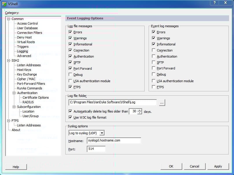 Server message logging Selected server messages may be logged in the VShell log file, sent to the Windows system log or a remote syslog/syslog-ng server. Message groups include errors, warnings, informational, connection, authentication, SFTP, port forward, debug, LSA, and FTPS.