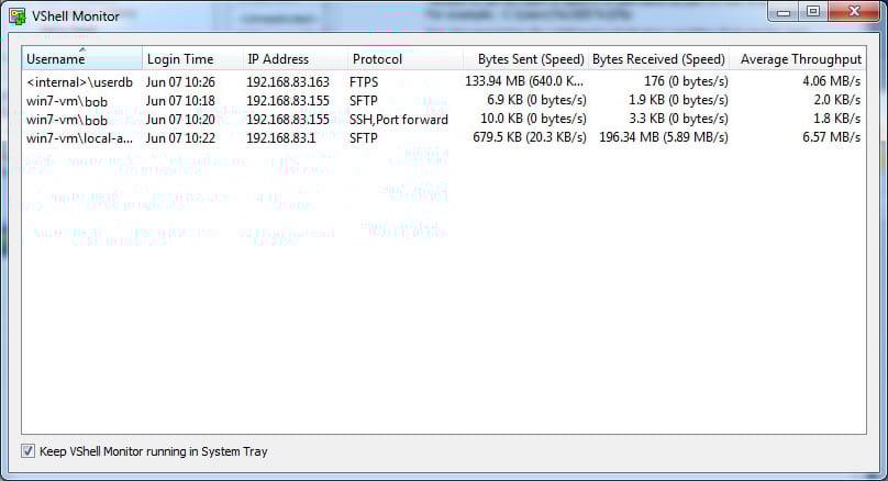 Monitor active VShell sessions VShell Monitor is a real-time connection monitoring tool that allows an administrator to view active connections to the VShell server.