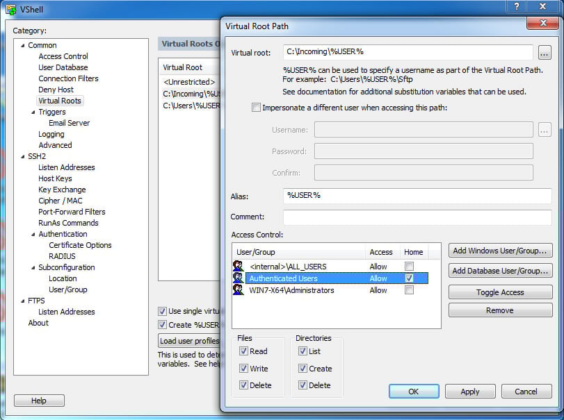 Multiple virtual root directories The VShell virtual root capability lets you assign different root directory access points to users or groups. Allows fine-grained control over user access permissions and the ability to specify the user's home directory.