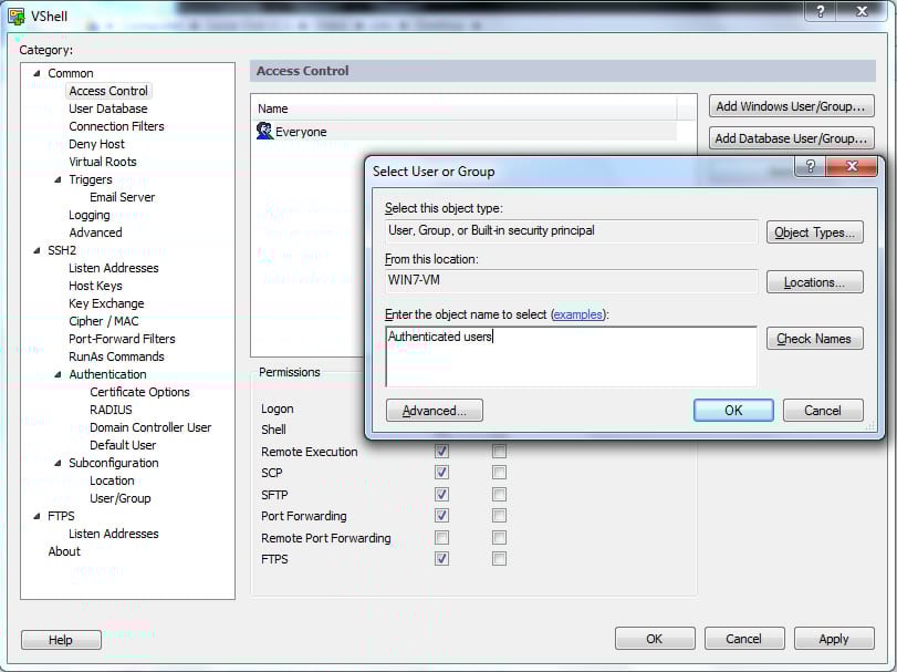 Access control Grant access to VShell services by authorized users or groups. On an individual or group basis, allow or deny access to VShell services such as shell, SCP, SFTP, FTPS, and port forwarding.