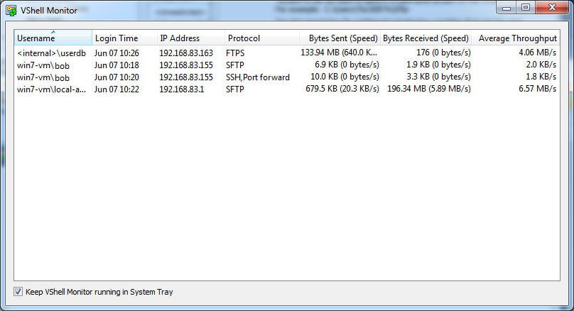 Monitor active VShell sessions VShell Monitor is a real-time connection monitoring tool that allows an administrator to view active connections to the VShell server.
